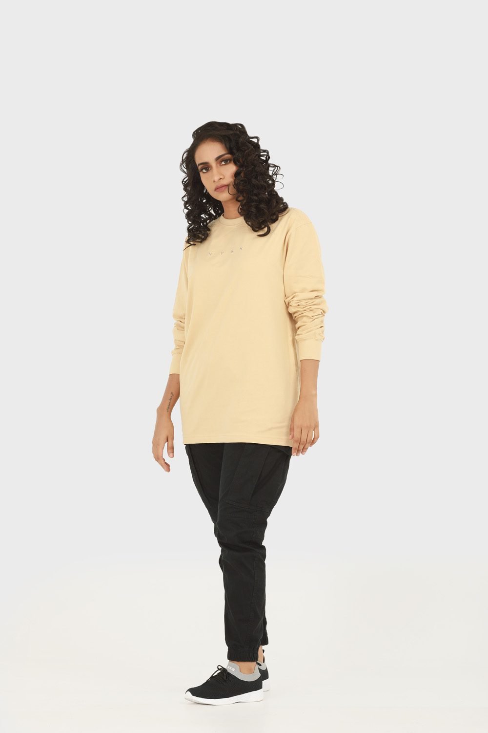 Style up your wardrobe with this oversized long-sleeve tee and rock that streetwear look. It is carefully made with soft fabric of premium quality that is 100% cotton. Style it with a pair of jean or tracks, throw in your favourite kicks and a cap for the desired hip-hop look. Wear it with confidence and ‘Vibe with vybn!’.